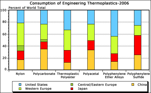 75% consumption of the major 5 ETPs- Polyamide, PC, PET, PPO/PS blends and POM, is in North America (40%) and Europe (35%). Asia including Japan accounts only for 25% market. The electrical/electronic industry is an important market of ETP. Flame retardant property is the prime important requirement of the electrical/electronic industry. Most of the plastic parts in these applications are required to be flame retardant. The E/E market requires materials/parts for new products to be evaluated against UL (Underwriters Laboratories) requirements. In Europe, RoHS (Restriction of Hazardous Substances) in E/E equipment and WEEE (Waste Electrical and Electronic Equipment) directives also mandate that flame resistance be achieved without the use of halogenated components. Limiting temperature index (LTI) is also an important UL requirement that specifies the maximum continuous use/operating temperature for a material. ETP has a good growth prospects for electrical/electronic market. A report by SRI Consulting focuses on the compounding of such engineering thermoplastic (ETP) resins as nylons, polycarbonates (PC), polyphenylene ethers (PPE), polyesters, polyacetals and polyphenylene sulfides (PPS). The report does not discuss the compounding of commodity resins, such as acrylonitrile-butadiene-styrene (ABS), polyvinyl chloride (PVC) or polyolefins, or high performance plastics, such as polysulfone, polyetherimide and polyetheretherketone. However, most compounders, especially independents that purchase resin on the merchant market, often compound both commodity resins and ETP resins. ABS resins are considered by many compounders to be engineering resins with many applications similar to those of the resins. A variety of modifiers can be incorporated into plastics, including fibers, mineral fillers, reinforcements, impact modifiers and pigments. Engineering thermoplastics are sometimes blended. Blending one polymer with another can produce attractive alternatives to costly, overengineered plastics and inexpensive but underengineered materials. Alloys are special classes of blends that exhibit homogeneous structures and usually display properties superior to those of conventional blends. In most cases, specially designed compatibilizing agents must be added to the polymer blend to improve the miscibility of the polymers. The following chart shows consumption of engineering thermoplastics by type. These regions account for 90% of total world consumption.  Transportation and electrical/electronic applications account for the majority of ETP consumption. The transportation market includes automotive, truck/bus, motorcycle, marine and aerospace applications. All electrical/electronic components used in vehicles are included in the transportation market segment. Consumption in this segment is driven largely by the automotive industry and represents approximately a 30-35% market share. The E/E market includes electromechanical (e.g., coils, bobbins, relays) and electronic components (e.g., connectors, sockets, switches), as well as business equipment housings (market share of 25%). Consumer end uses (with a 10% share) include lawn and garden equipment, power tools, office furniture, sporting goods, toys and miscellaneous products (e.g., pens, lighters, picture frames). Industrial applications (market share of 15%) include lighting/glazing, material fluid handling equipment and plumbing/irrigation components. Finding and filling niches is an important factor for success in the compounding of engineering thermoplastics. Innovative niche development is a prime reason for the success of one compounder over another. Reliable delivery is extremely important to both the processors of ETP compounds and the original equipment manufacturers (OEMs) they serve. Successful compounders usually maintain excellent technical service capabilities and/or technically oriented salespeople to assist processors and OEMs with specifications, materials selection and problem solving. Large international OEMs are increasingly interested in limiting the number of their suppliers to increase efficiency through improved coordination and to increase the participation and commitment of suppliers to product development. Multiple plant locations and stocking points allow fast delivery and optimize service to regional customers. Just-in-time (JIT) production and delivery are becoming more important |